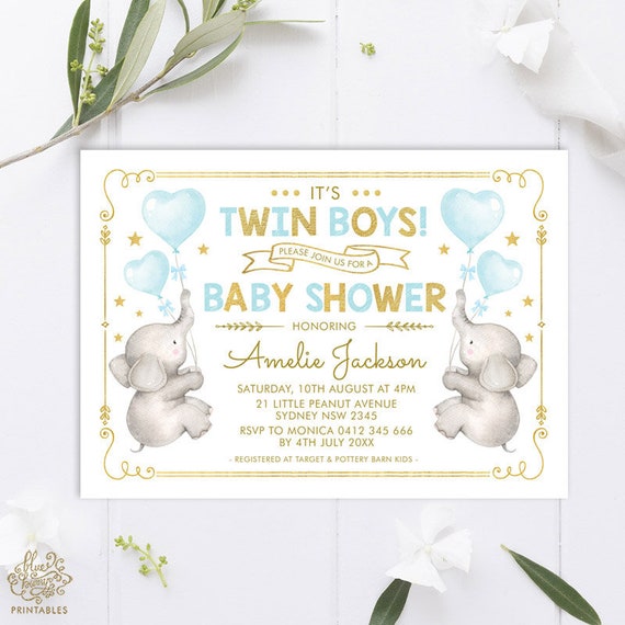 Twin Boys Elephant Baby Shower Invitation Blue Gold