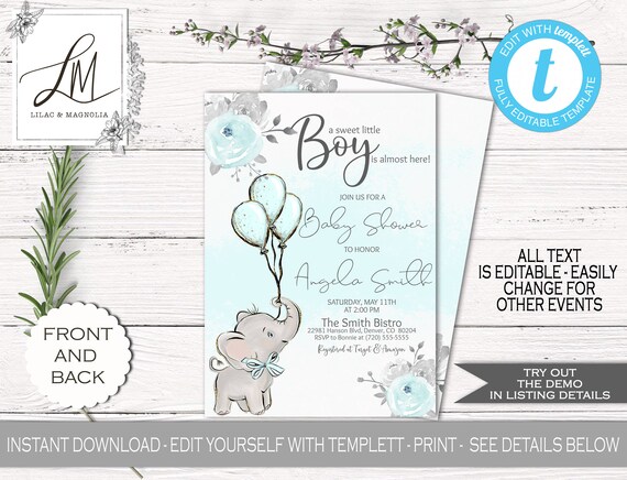 Elephant Baby Shower Invitation Editable Baby Elephant