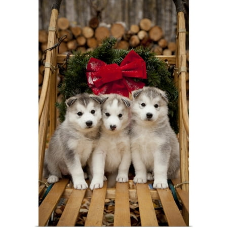 Great Big Canvas Rolled Jeff Schultz Poster Print Entitled Siberian Husky Puppies In Traditional Wooden Dog Sled With Christmas Wreath Alaska